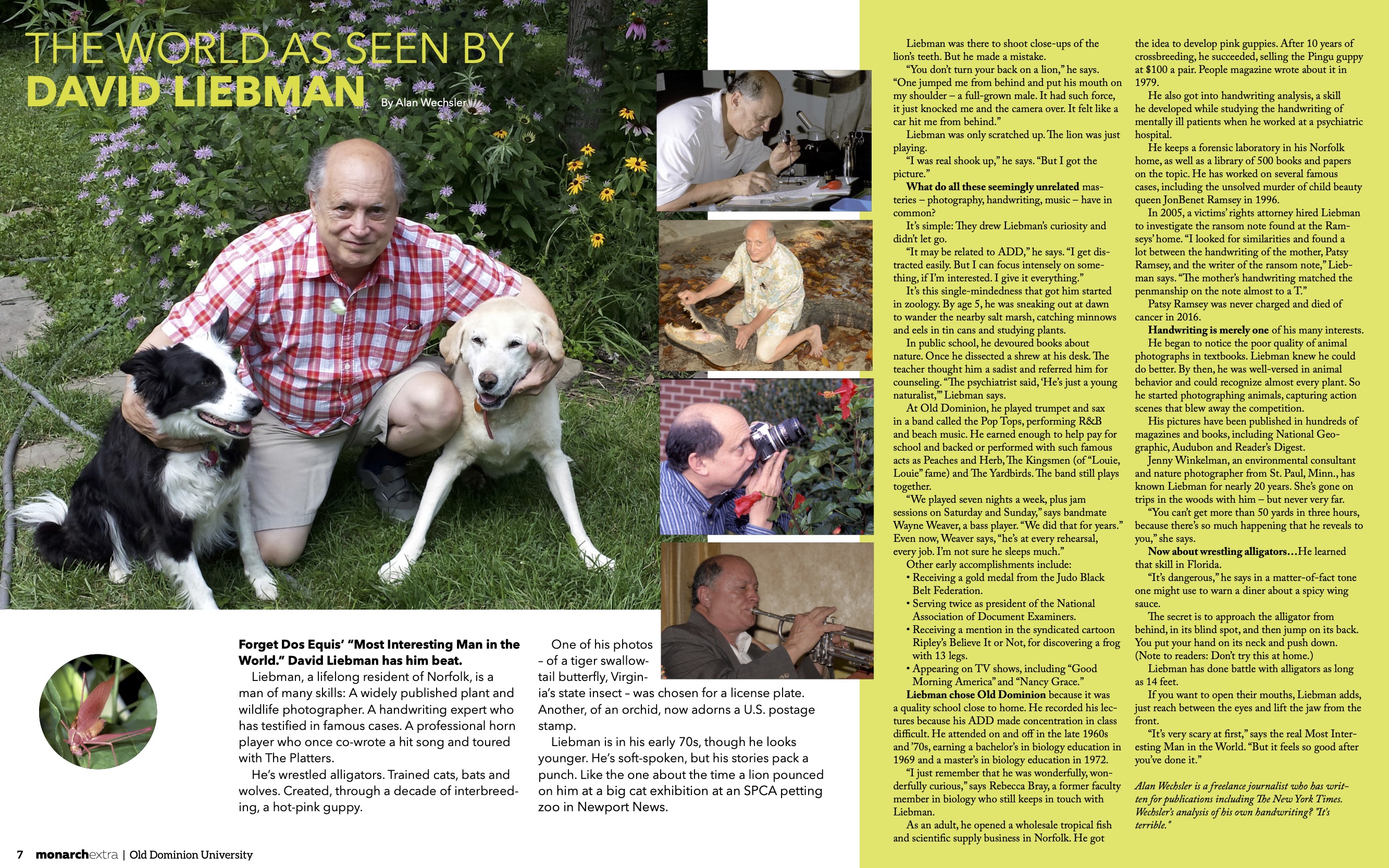 Q: Tell us a little about yourself. A: I am a lifelong resident of Norfolk and a proud ODU alum, a published wildlife and plant photographer lucky to be in hundreds of magazines and books including National Geographic, Audubon and Reader’s Digest, a nature tour guide and frequent lecturer on a variety of topics including botany, zoology, geology and entomology, a handwriting expert testifying in high-profile cases such as JonBenét Ramsey, a professional trumpet player performing with acts like The Kingsmen of “Louie, Louie” fame and The Yardbirds, a rehabilitator of wild animals, judo black belt, entrepreneur, and collector of early Basquiats.
