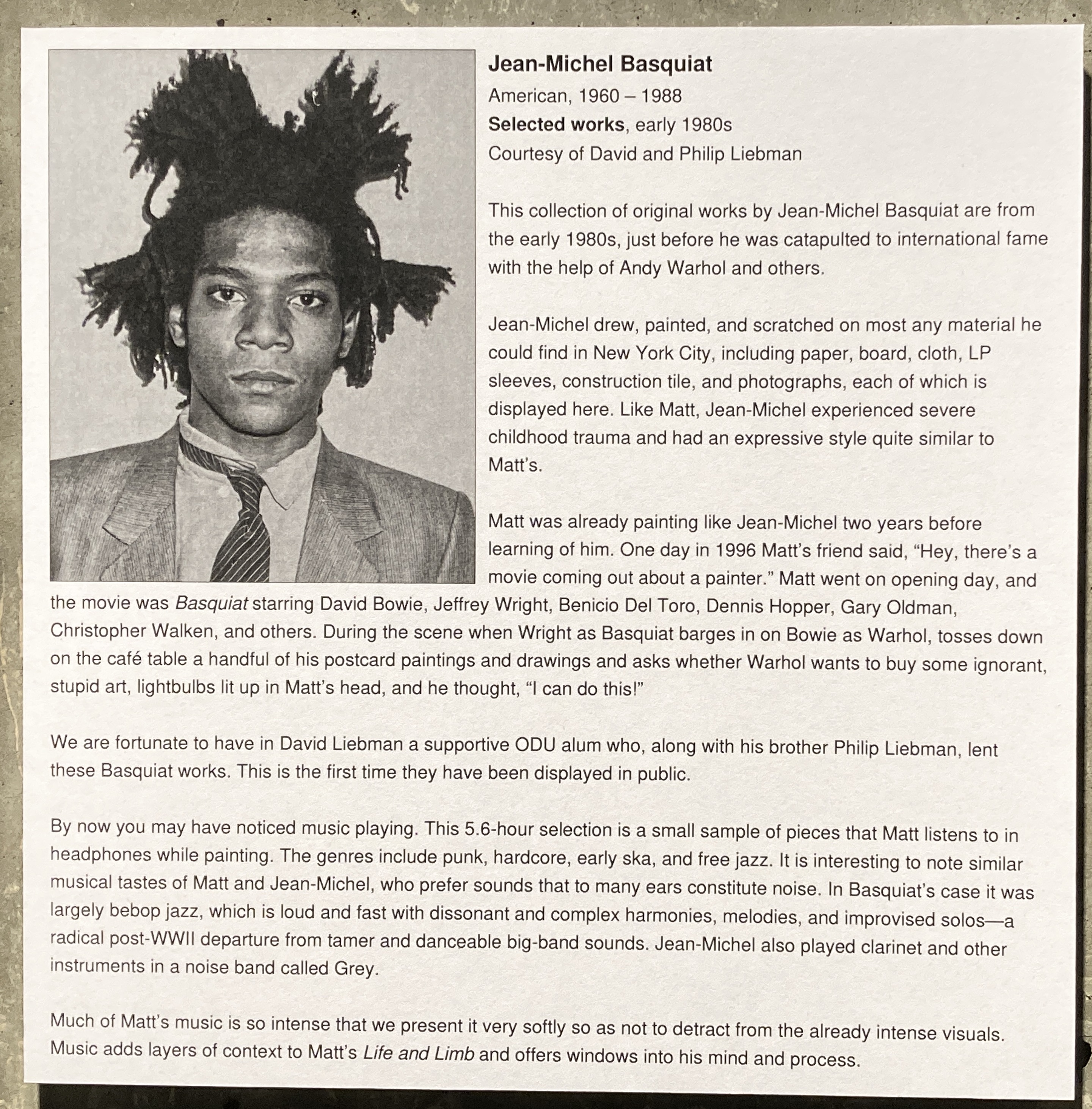 We photograph and put three questions to lenders of artworks when they visit the “Life and Limb: Works by Matt Sesow” exhibition for our “Meet the Collectors” series. David Liebman of Norfolk, Virginia lent several works for the show and is seen here with 13 of his and his brother Philip Liebman’s works by Jean-Michel Basquiat from the early 1980s.